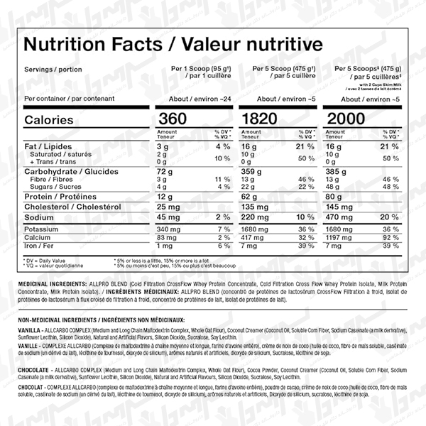 مس گینر آلمکس ALLMASS ۵.۴۴ کیلو شکلاتی یک گینر پیشرفته و پرکالری برای افزایش وزن و حجم عضلانی است که با ترکیبی از پروتئین چندمنبعی (وی کنسانتره/ایزوله، کازئین و پروتئین شیر) و کربوهیدراتهای ترکیبی طراحی شده تا به افزایش کالری دریافتی، ریکاوری بعد از تمرین و رشد عضلات در دوره حجم کمک کند؛ مخصوصاً برای افرادی که بهسختی وزن میگیرند یا مصرف غذای کافی برایشان دشوار است.