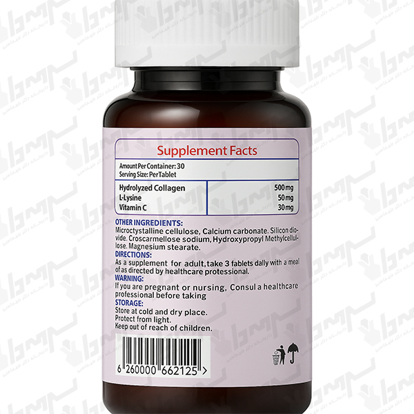مکمل ترکیبی برای سلامت پوست، مو و ناخن و حمایت از مفاصل، غضروف و استخوانها؛ حاوی کلاژن هیدرولیزه 500mg + L-Lysine 50mg + ویتامین C 30mg در هر قرص برای کمک به ترمیم بافتها و کاهش نشانههای پیری.