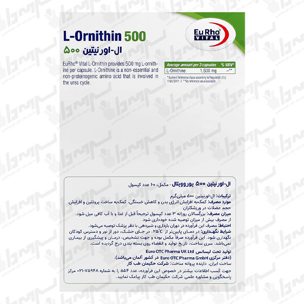ال اورنیتین یوروویتال مکمل تغذیهای حاوی ۵۰۰ میلیگرم L-Ornithine HCl در هر کپسول است که در بزرگسالان برای کمک به افزایش سطح انرژی و کاهش خستگی، حمایت از ریکاوری و پروتئینسازی در ورزشکاران و همچنین کمک به کاهش استرس (کاهش کورتیزول) و بهبود خلقوخو/کیفیت خواب مورد استفاده قرار میگیرد.