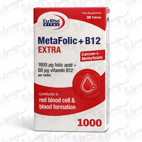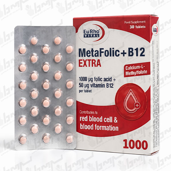 متافولیک پلاس B12 اکسترا مکملی حاوی ۱۰۰۰ میکروگرم فولات (به فرم فعال کلسیم ال-متیل فولات) و ۵۰ میکروگرم ویتامین B12 در هر قرص است که برای حمایت از خونسازی، کمک به کاهش خطر کمخونی، بهبود عملکرد سیستم عصبی و افزایش انرژی و کاهش خستگی طراحی شده است. این فرمول میتواند برای افرادی که نیاز بالاتری به فولات دارند (با تشخیص پزشک) و همچنین گیاهخواران جهت تأمین B12 مفید باشد.
