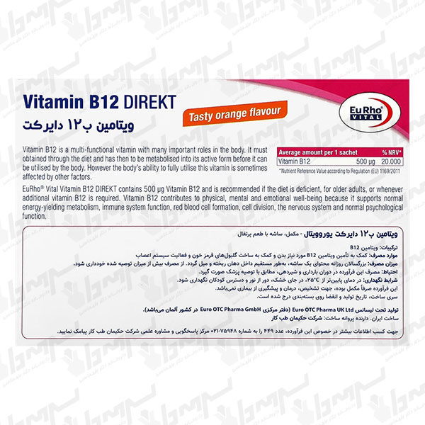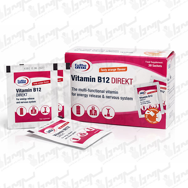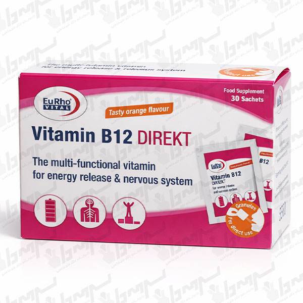 Vitamin B12 Direct Eurho Vital یک مکمل ساشهای (پودر خوراکی مستقیم) برای تأمین ویتامین B12 است که در هر ساشه 500 میکروگرم ویتامین B12 به فرم سیانوکوبالامین فراهم میکند. این محصول برای کمک به افزایش انرژی و کاهش ضعف و خستگی، حمایت از سیستم عصبی و کمک به خونسازی و رفع/پیشگیری از کمخونی مگالوبلاستیک ناشی از کمبود B12 طراحی شده و میتواند به تنظیم هموسیستئین نیز کمک کند. دارای طعم پرتقال است و برای سنین بالای ۱۸ سال مناسب میباشد.