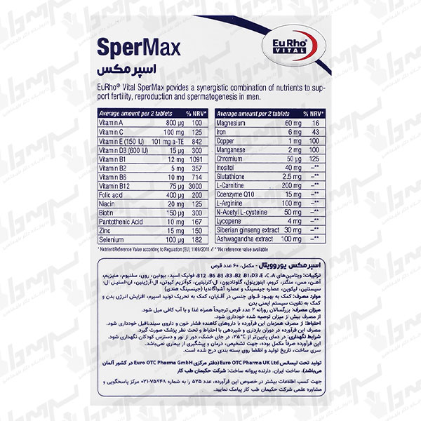 اسپرمکس یوروویتال مکمل تخصصی آقایان برای حمایت از باروری و عملکرد جنسی است که با ترکیبی از ویتامینها و مواد معدنی (مثل زینک و سلنیوم)، آنتیاکسیدانها (مثل لیکوپن، گلوتاتیون، Q10)، اسیدهای آمینه (ال-کارنیتین و ال-آرژنین و NAC) و عصارههای گیاهی (جینسینگ سیبری و آشواگاندا) به محافظت از اسپرم در برابر استرس اکسیداتیو و کمک به بهبود تعداد، تحرک و کیفیت اسپرم کمک میکند.