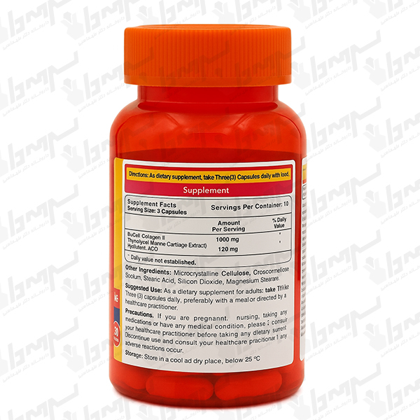 مکمل زیبایی و مفاصل با ۱۰۰۰ mg کلاژن BioCell (دریایی، نوع ۲، هیدرولیزه) و ۱۲۰ mg هیالورونیک اسید در هر ۳ کپسول؛ کمک به آبرسانی و جوانسازی پوست، کاهش چینوچروک، تقویت ناخن و مو و حمایت از غضروف و حرکت مفاصل.
