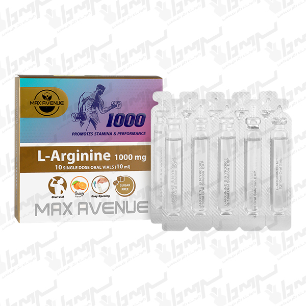 ال-آرژنین 1000 Max Avenue محلول خوراکی تکدوز (۱۰ میلیلیتر) با ۱۰۰۰mg ال-آرژنین در هر ویال؛ پشتیبان پمپ عضلانی و استقامت، کمک به اتساع عروق و جریان خون، حمایت از ترشح هورمون رشد و بهبود عملکرد ورزشی. طعم پرتقالی، فاقد شکر افزوده.
