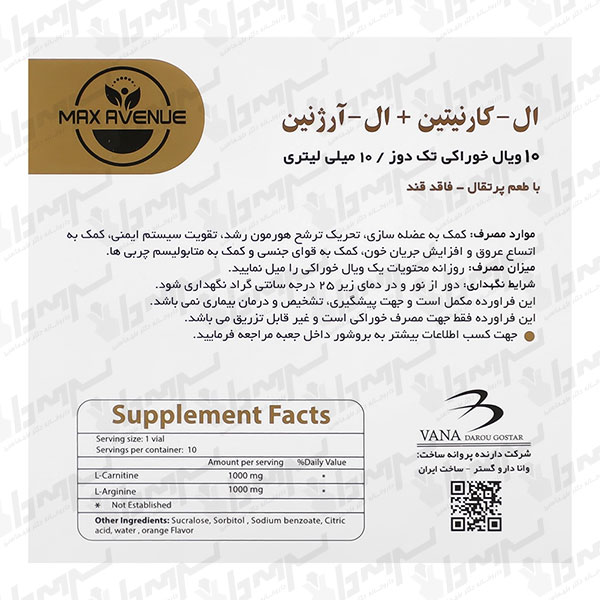 ویال خوراکی ال کارنیتین + ال آرژنین مکس اونیو یک مکمل فاقد قند (طعم پرتقال) است که در هر ویال ۱۰ میلیلیتری، ۱۰۰۰ میلیگرم ال-کارنیتین و ۱۰۰۰ میلیگرم ال-آرژنین دارد و برای کمک به افزایش انرژی، متابولیسم چربیها، اکسیژنرسانی بهتر به عضلات و ارتقای عملکرد ورزشی طراحی شده است.