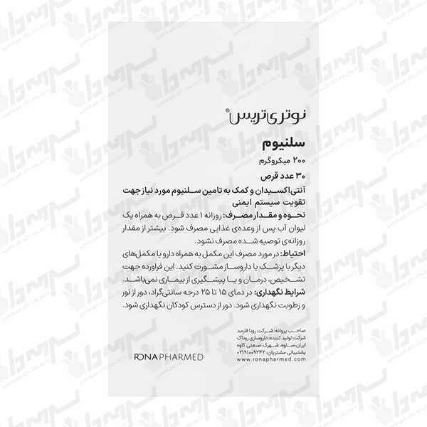 برای اطلاع از قیمت روز و موجودی سلنیوم ۲۰۰ میکروگرم ۳۰ عدد نوتریتریس میتوانید از طریق صفحه این محصول در داروخانه آنلاین سرمهدان اقدام کنید.