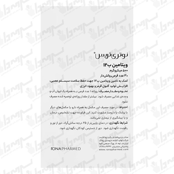 برای اطلاع از قیمت روز و موجودی ویتامین ب۱۲ نوتریتریس ۵۰۰ میکروگرم میتوانید از طریق صفحه این محصول در داروخانه آنلاین سرمهدان اقدام کنید.