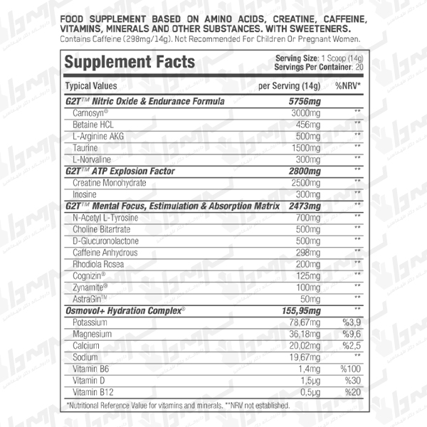 ترکیب پیشسازهای NO، بافرهای اسیدی، تقویتکنندههای ATP و نوروتروپها باعث افزایش جریان خون، بهبود انتقال عصبی و انرژی سلولی شده و نتیجهٔ آن افزایش توان لحظهای، استقامت و تمرکز حرکتی است.