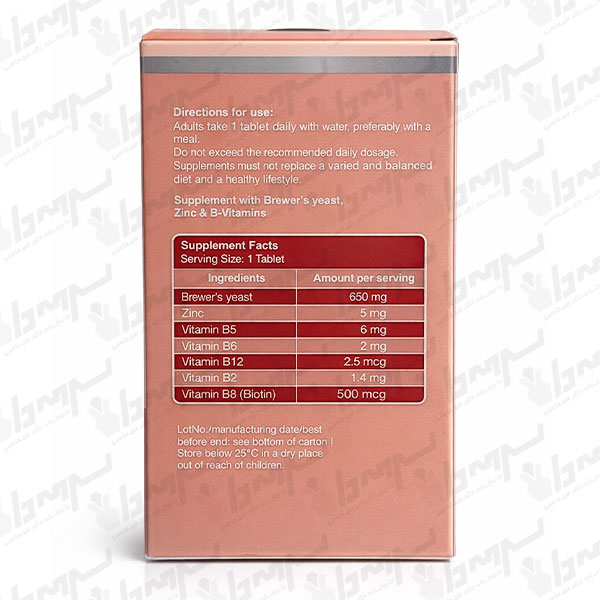 این محصول مکملی حاوی مخمر آبجو بههمراه زینک و ویتامینهای گروه B است که به حمایت از سلامت پوست، مو و ناخن و تامین ریزمغذیها کمک میکند.
