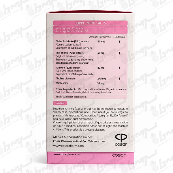 | عصاره کنگر فرنگی (25:1) معادل 1500 mg گیاه خام | Globe Artichoke (25:1) extract equivalent to 1500 mg of raw herb | 60 mg | ** |