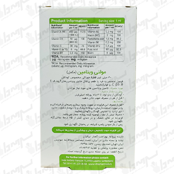 مکمل کامل و خوشطعمِ کودکان از بدو تولد تا ۱۲ ماه؛ حاوی ویتامینهای A, D3, C, E و گروه B با D3 = 400 IU برای استحکام استخوان و دندان، تقویت سیستم ایمنی و رشد طبیعی کودک. فاقد گلوتن و لاکتوز، طعم پرتقال برای پذیرش بهتر.